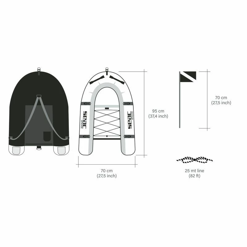Longueur 95 cm, Largeur 70 cm, Drapeau de 70 cm de haut, 3 chambres à air indépendantes en PVC et 25 m de ligne fournis.